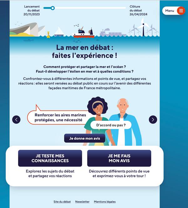 Parmi les moyens de participer, découvrez et partagez « La mer en débat : faites l'expérience », un outil grand public qui permet de s'informer et d'entrer facilement dans le débat : cliquez ici